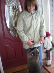 I turned to see a raccoon ambling up the walkway toward the front door. “Mom! Check out the raccoon! There’s a raccoon out here!â€Â I was preparing to make a run at the fuzzy ball. “It’s okay, it’s a pet.â€Â  Our hostess had closed the door, making sure the raccoon stayed out, but now we were looking at the raccoon as he walked right up to us, climbing up Mom’s leg to stand on his back feet and play with the keys in her hand. Raccoons are big. They’re big in the way porcupines are big. Mom and I looked at each other. “Can we pet him?â€Â I was hoping she knew more to the story than I did. “I don’t know.â€Â  She reached down and stroked his back. Cool. My turn. Raccoons are also soft. At least this guy was. And he was curious. He had abandoned the keys and had his head up under my mom’s jacket at this point.