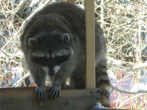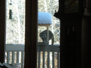 Every so often, we see the raccoons. Their white markings stand out against the dark glass, as they peer into the warm living room in the evenings. I half expect them to reach up and turn the doorknob. Usually, when we go to take a look or turn on the light, they crawl to the railing and lower themselves down into the snow, shimmying down the 6 foot post.