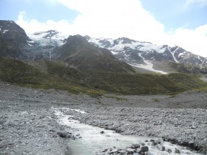 From the village we were treated to some excellent views of Mt. Cook and the surrounding mountains, complete with their spectacular hanging glaciers.
