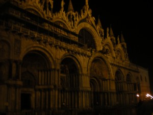 On the other side of the bridge I found myself in a seriously polished commercial district.  I think I passed three Gucci stores, along with every manor of upscale retailer.  This well traveled district between the Rialto and Saint Mark’s must be one of the busiest during the day, full of the tourists that keep the town alive.  The rain and the number of tourists picked up as I headed into Saint Mark’s square at about 10PM.  It was dark, and mostly deserted.  The young pub-crawlers that were everywhere on the other side of the bridge remained there, giving way to vast seas of little tables and chairs – empty outdoor dining areas, all closed for the night.  The whole place had a ghostly feel, the four horses on the front of the church galloping onto a dark, empty piazza.