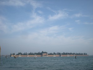 The first site on my list was the island of Murano, famous for its glass furnaces.  I’d have to take a vaporetto ride out and back.  So, I walked up to the top of Venice, bought a ticket and hopped on a boat.  The ride itself was beautiful, taking me past the dramatic island cemetery.