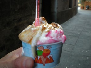 I’m pretty sure the woman behind the counter could speak English, but she was kind enough to humor me as I asked her what went well with “amorena,†winter cherry. She rattled off a list of flavors, and the only one I really heard was ricotta. “Ricotta?†“Si, con figgi.â€Â Figgi! I learned that word last time when we had the most amazing fig tart ever. So, I ordered a cup of amorena and ricotta con figgi. My first fully Italian interaction. I even understood the cost as she said it to me the first time. Brava!