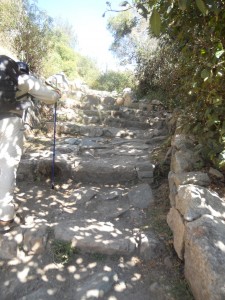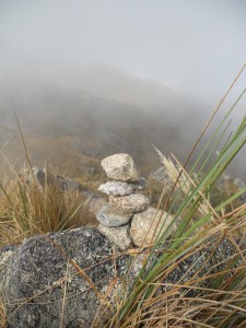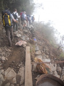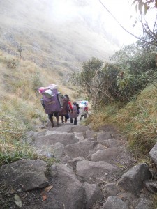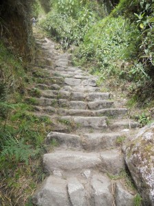 We really did hurl ourselves. Odon had mentioned that the porters run downhill, not only because they need to beat the rest of the trekkers into camp, but because it’s easier on your body to run. I’d known this to a lesser extent from running cross country in high school. But the idea of running with 30 lbs on my back was a little daunting. By this time, we trusted Odon. So we decided to give it a try. Down a gazillion rough-hewn rock steps in the middle of the Andes.