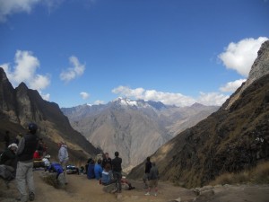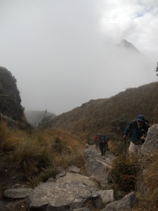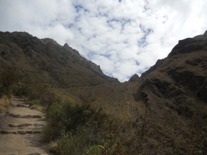 It was three hours before we had any view of the pass. Three hours of walking up the trail, climbing up the steps that seemed too large for small Inkans, three hours of stopping to breathe. When we finally saw the pass, and the line of people, like cliché ants winding their way closer, we all stopped. A bunch of us were heading up at the same pace, leapfrogging each other as we stopped to take pictures, and to suck down water from the tubes that ran over our shoulders from the bladders in our packs. The act of biting the plastic, sucking and swallowing was almost too much to do while hiking. It left me nearly breathless, struggling to catch wind while I scrambled along the path.