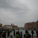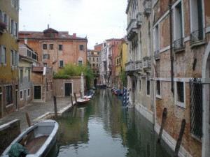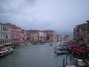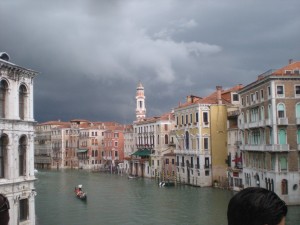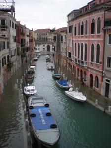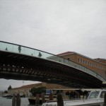 For some reason, these were being sold in the one area of town that was dry. And that’s where people were wearing them. Insanity. I really could have used some of those boots about an hour earlier. It was alright, though. The water in my shoes had finally warmed to the temperature of my feet, and I was having a grand adventure. I found one of the very few shops that was open (I’d had to abandon my hopes of shopping on the way to the station), bought some breakfast, took a last look at the city as I walked the span of the newest bridge over the Grand Canal (that I had read about in the guidebook) and found a place to empty my shoes.