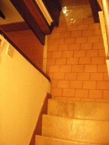 Yes, that’s water at the bottom of the stairs. The dining room was totally flooded. In fact, the front door stood open, and several people were sitting at partially submerged tables. They were all wearing high rubber boots. (The guidebook said nothing about boots.) I stepped into the water and watched the eyes of the locals widen. “Coragea.â€Â No, I wasn’t brave, just hungry, and wondering what else I was supposed to do. The frigid sea water rushed into my waterproof shoes and up over my ankles. I walked to the front door and looked out.