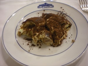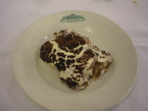 My waiter ran through the list of dolce. I had only one question, “che fatti en casa?â€Â I’m pretty sure the sentence structure is incorrect, but the question almost always gets good results. He smiled. “Tiramisu e buono.â€Â He didn’t even wait for a response. He virtually jogged to the dessert table, scooped out some tiramisu and presented it proudly to me.