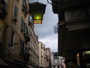 Finding anything in Venice is a challenge, and finding something after dark in Venice is a special treat. Fortunately, the Trattoria had a big sign, and huge, green lanterns placed at the entrance to the little street it inhabited.