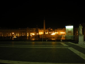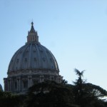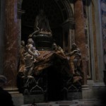 The crypt was interesting – sterile, but interesting. There was lots of white marble, and reclining statues of dead popes. A recording played over and over in different languages reminding people that this was a holy place, and inviting them to remain quiet for reflection. Most interesting to me was St. Peter’s tomb, which is partially visible from the crypt and from the floor of the basilica, as well as the tomb of Pope John Paul II. I grew up Catholic under the tenure of this man. His tomb was brightly lit, very plain, and guarded by a sadly smiling guard who stepped over the ropes to touch holy items to the tomb, handed to him by passing visitors. I looked in my bag, but didn’t quite think a hot pink pencil made the cut, so I passed nothing over to the dead pope for a blessing.