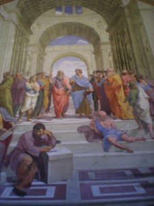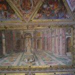 I spent my time in the Egyptian and Etruscan rooms, then wandered through halls of tapestries and super-old maps. Along with 8 gazillion noisy tourists, I arrived in the Raphael rooms, decorated by the master and his students. Here’s that painting of that arch from the Forum: