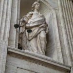 The sky was turning pink over the square. I walked past the colorful Swiss Guard, and found Lady Justice (without blindfold) standing overhead. Well, at least she wasn’t in the crypt…