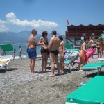 The built-in shades were amazing.  For the next couple of hours we bathed in the sun, swam in the sea, and watched the scene unfold in front of us.  Spettacolare.  Sailboats danced across the bay, competing for our attention with the sea of humanity dancing on the sand.  A pair of men, lounging in their tiny swimsuits, and gold chains, gestured wildly, emphatically trying to convince each other of their position on some unknown topic.
