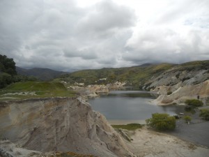 The trail ran through the remains of a sluicing operation – a great lake made by the use of pressurized water to wash away gravel and mud, revealing gold. Supposedly, when the light hits the water, the lake turns an unearthly blue. It was an overcast day, so we didn’t see it, but the carved walls surrounding the lake, and the old pipes still sticking out of them were unearthly enough for us.