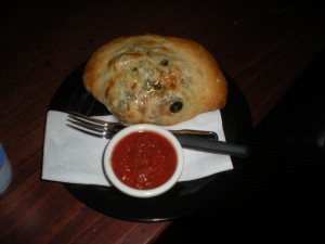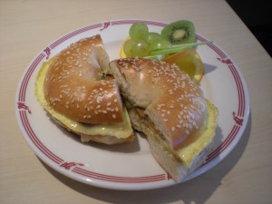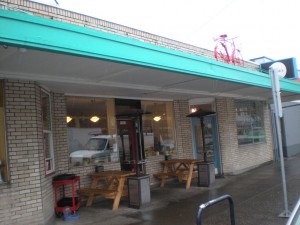 I got something called the “flat tireâ€. It had scrambled egg, cheese, aoli and veggie-bacon on a sesame bagel. Super-yum. When I ordered, I asked them to leave the bacon off. Forgetting I was back in Portland, I was surprised when the guy behind the counter offered me veggie-bacon. Yup, veggie-bacon. That just about made my day, not because I like bacon, but because I was reminded of the coolness of Portland.  And, as the sandwich sat there, the aoli melted and coated the bread and egg.