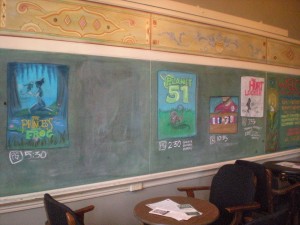 Yesterday, I checked in to my room – Originally “classroom 4†and now the “Mirror Mirror†room, and headed to the theater for some dinner and a movie. Along with lodging, the room rate includes free movies in the old auditorium and unlimited soaking in the soaking pool.
