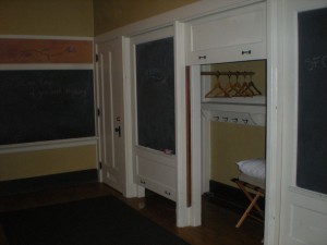 The room itself was pretty darn cool. The walls were lined with the original chalkboards, some of which were sliding panels enclosing old-school  coat racks doubling as a closet. Too cool.