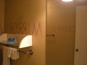 The room was decorated with phrases from the fairy tale “Snowdrop†(you might know it better as Snow White and the Seven Dwarves). The “Mirror, mirror on the wall†sequence was cleverly written backward on the bathroom wall.