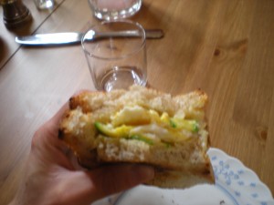 The morning was filled with the usual routine: coffee, breakfast, a trip to the fashion outlet, work in the studio. You know, the usual. Lunch was a makeshift affair, during which I made one of the tastiest sandwiches ever from some wonderful bread, eggs, cheese and zuccnini.
