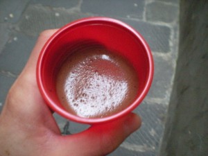 The town is alive with chocolate-crazed tourists and locals hopped up on sugar and cocoa, and possibly thoughts of virgin mothers – hard to say. The chocolate really seemed primary. After making a circuit of the chocolate route, I picked out a little ciocolata calda stand that looked like it was a non-profit fundraiser, and bought 4 cups to take back to the studio. Once I got back there, I looked up the words from the sign on the little table. I was glad to find out it was the anti-leukemia society.  I hadn’t been sure exactly what I was supporting, but the ladies selling the chocolate were nice – and smoking.