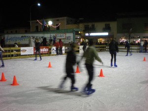 So Tom and I rented our skates (which were blue plastic hockey-type skates, and soaking wet inside) and headed out onto the bumpy rink. The rinks I’m used to are pretty big, and smooth. The rinks at Sun Valley kick people off every hour or so to clean the ice with a Zamboni. This ice on the little piazza in Fornaci is a week old, and has endured several days of rain. Tom assured me that it was smooth the first day.  Regardless, it was great – just a little extra challenging.