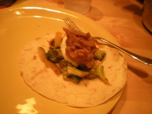 That’s right, folks, taco night!  I’d picked up tortillas, chips, salsa and refried beans. These were all specialty items and there wasn’t much selection. The chips came in a tiny little bag, and the beans looked like they’d been on the shelf for years. While the others had chicken tacos, I served up veggie tacos with cauliflower, broccoli, carrots, peppers and leeks. Super-yummy!