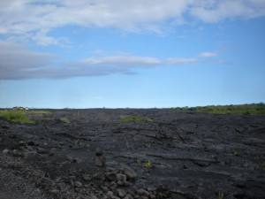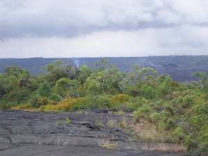 Our already long day was just about halfway over, when we climbed back into the car and headed for the lava flow. We usually take a route past the Kilauea caldera, down the Chain of Craters Road, to the point where the new lava is emptying into the ocean. Parking where the road is overtaken by lava, and walking in about a mile, you can see the plumes of steam rising where the hot and cold mix. This year, the road is closed, due to new activity in the caldera, so we drove a different route to where the newest lava flow has been making its way to the ocean.