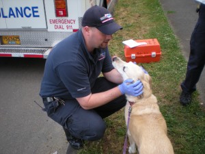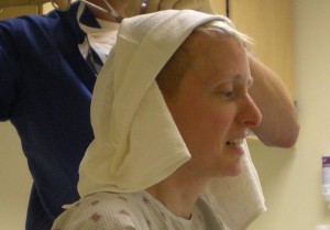 Leigh being bandaged. The EMTs were a little quick to say there was no other way to bandage her head. Very funny, guys.