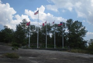 So I tried the nature path. The path led past flags of the confederate states. Scarcely little information was provided. Too bad, really. I was happy to learn more. But I’d have to do it online. I walked down to the front of the lawn and back around. I saw the scenic railroad cars filled with tourists. I saw the high-ropes course and the recreated “Crossroads†town. I saw the white families playing volleyball in the shadow of the mountain, and the young black men wearing “Stone Mountain†polo shirt uniforms as they staffed the attractions.