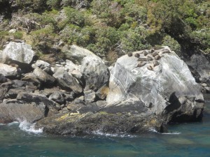 The Milford Sound is on the Tasman Sea, and, as we learned on the bus ride, is misnamed. It’s not a sound at all. Sounds are v-shaped, underwater valleys created by flowing water. Fiords, which the Milford is, are u-shaped and created by the movement of glaciers. Whatever it was, it was a body of water surrounded by mountains rising directly out of the seabed, and we were excited to see it.