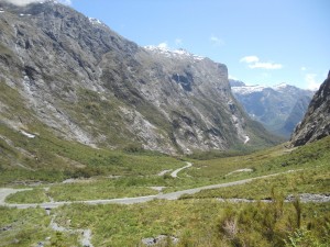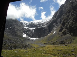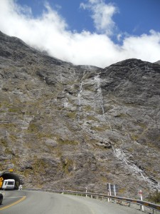 The Divide, as it’s known, is the point where three major tracks come together. Travelers who have been walking for days are dumped out at this shelter, a rest stop halfway between Queenstown and the Milford Sound to wait for their rides. We had scheduled a bus pick-up to take us to the Sound and then back to our van in Queenstown, so that we wouldn’t have to doubleback in order to see one of New Zealand’s great natural attractions, Milford Sound.
