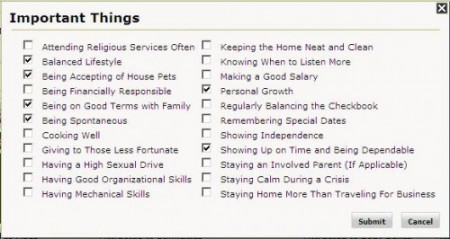 About the time I was halfway through my second profile, I realized that I’ve never really sat down and tried to define myself this way.  I’m not entirely sure how I feel about defining myself through a series of check boxes, but I’ll tell you that the Curve process made me stop and think a bit.  Aside from telling me that my usual “flicktastic” username contained profanity, the Curve profile asked me to choose from a list of “important things.”