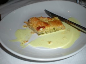 First was a lovely, delicate pastry filled with zucchini, and drizzled with a saffron sauce.