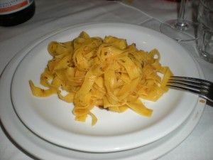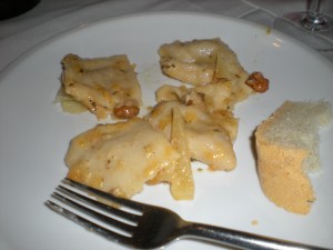 As the first plate of pasta came out, I started to wonder if I’d make it through all the courses. The pasta, however, was so incredible, that I stopped thinking and started eating in earnest. Fortunately, I accepted only a few of the beautiful ravioli, which were filled with pureed squash (pumpkin, I think) and maybe caramelized onions, and covered in lovely butter, cloves and walnuts.